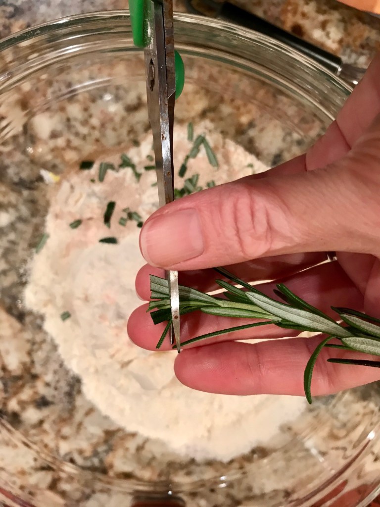 - Add chopped, fresh rosemary (from 4-5 sprigs from a grocery store fridge pack; cut with kitchen shears) or 1 T dried rosemary to the dry ingredients.