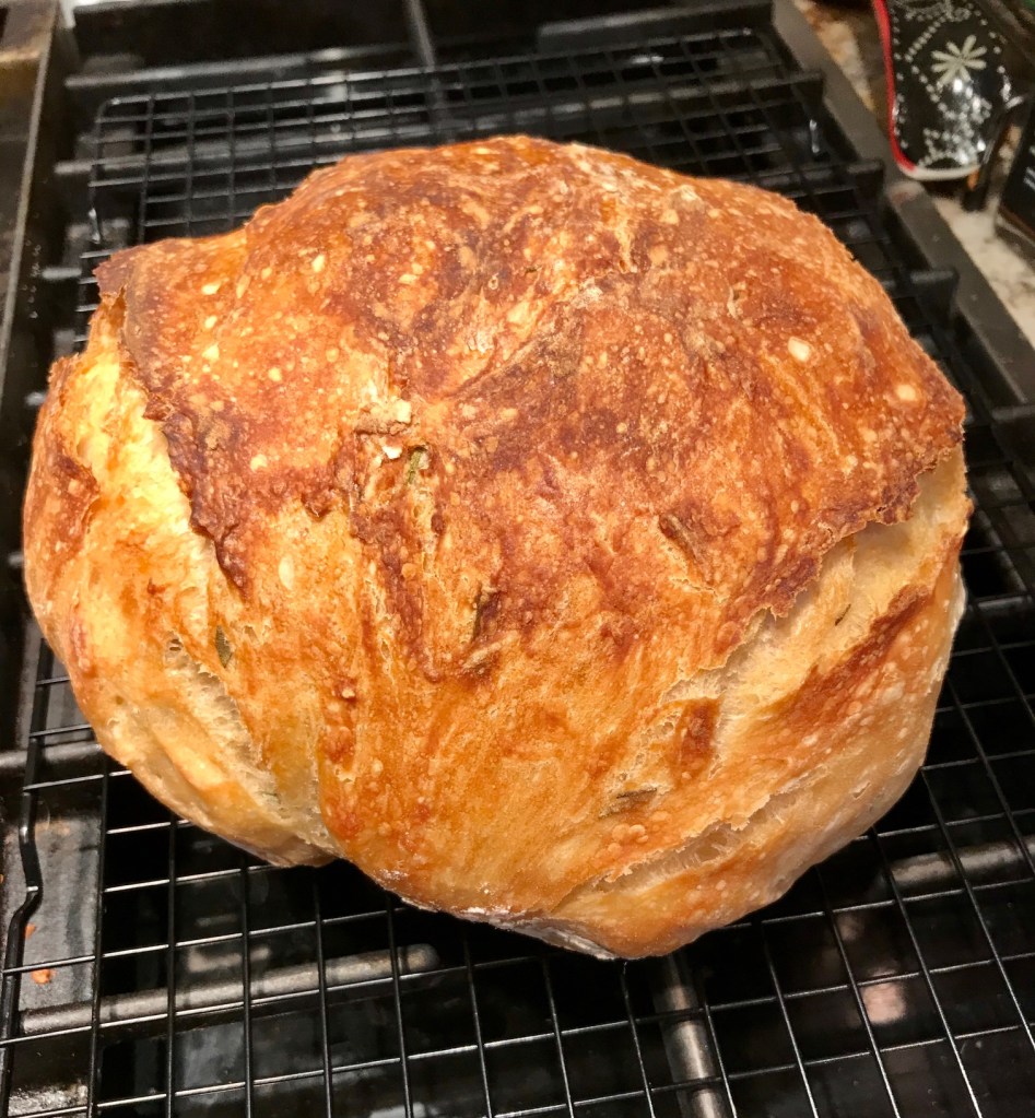 - Remove pot from oven, remove bread, and place on a cooling rack to cool.