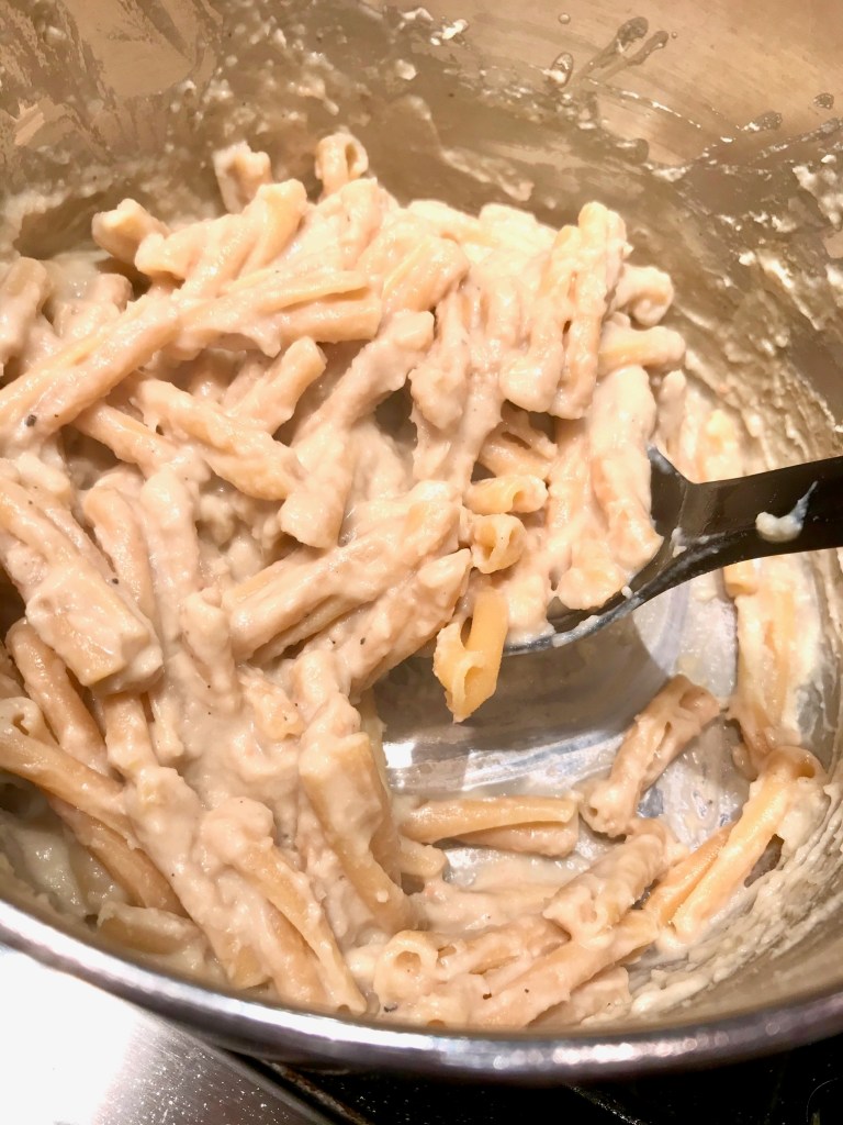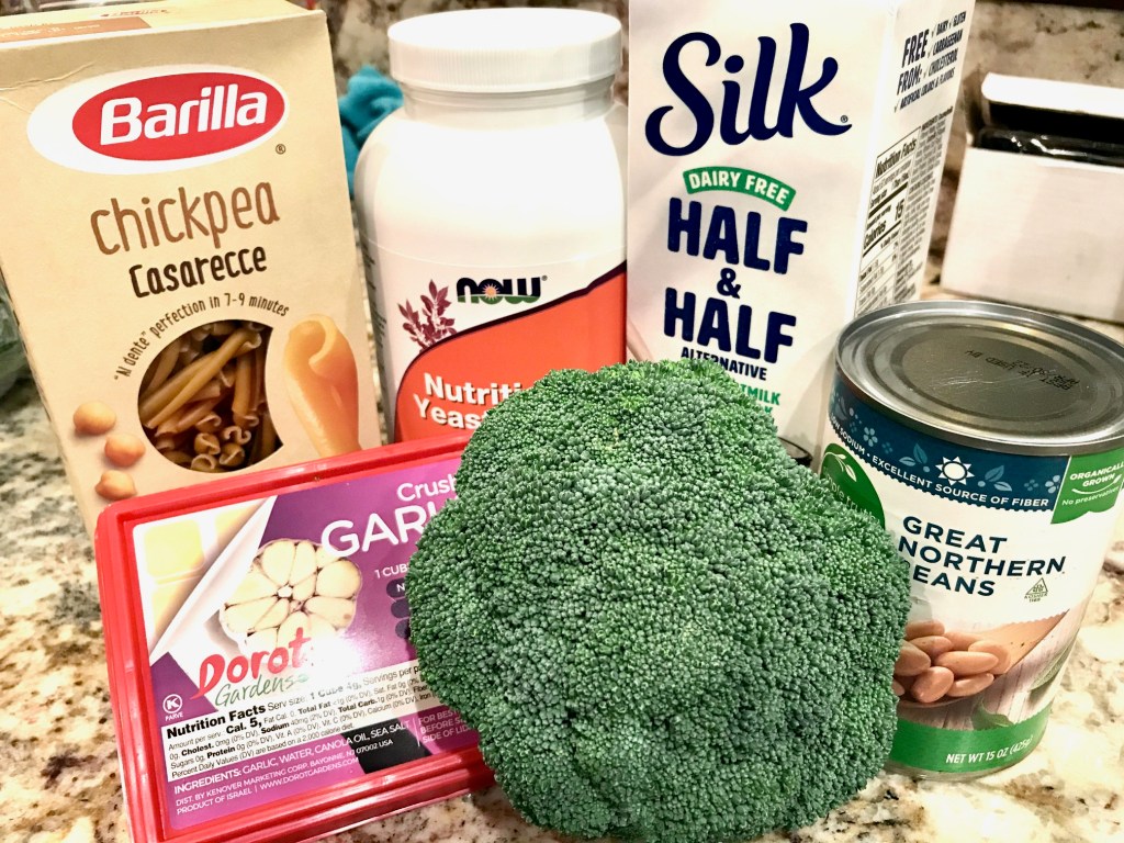Now let’s get back to cooking. My friend and fellow runner Niki asked that I share some recipes which are high in protein, vegan, nut-free, soy-free, and gluten-free, as well as some ways to incorporate nutritional yeast. I immediately thought of an improvised version of a creamy alfredo sauce I created a few weeks ago. I served it over regular wheat pasta, but with a swap out for bean-based pasta, this will satisfy both the GF and higher protein needs. Here you go, Niki!