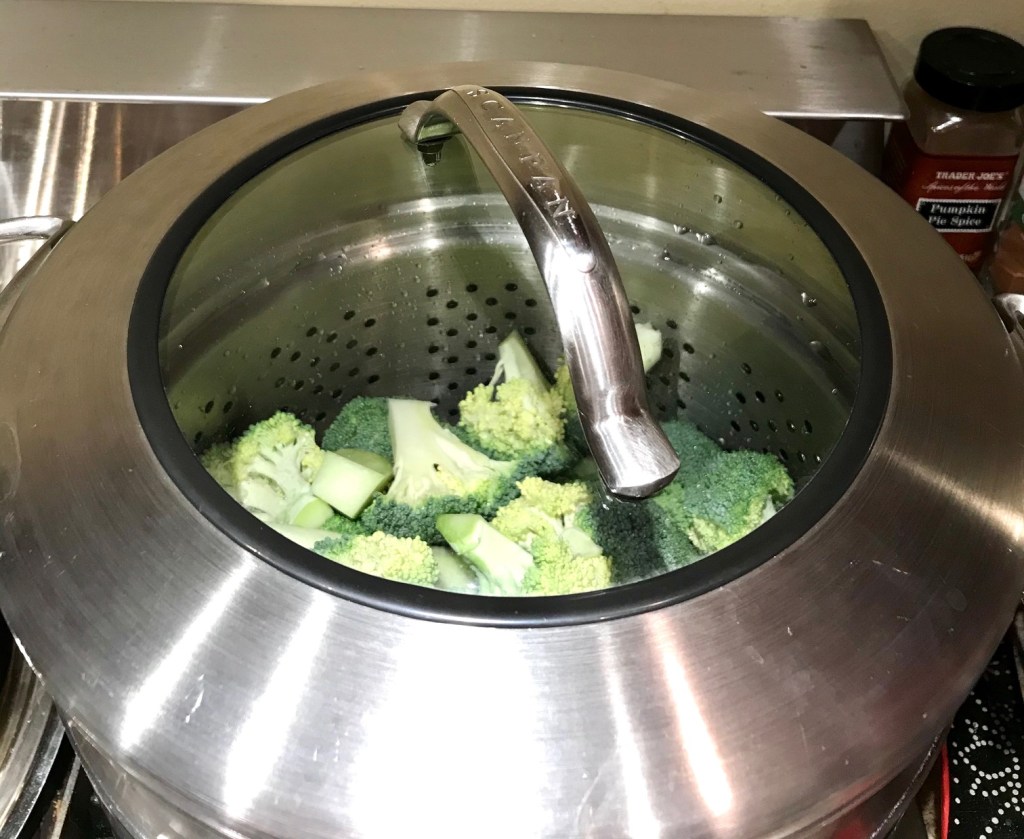 - Alternatively, if you want to use your microwave, place all broccoli in a tempered glass measuring cup, like Pyrex, add a bit of water (about ÂĽ depth of vessel), cover with a plate, and microwave for 4-5 minutes until desired tenderness is achieved.