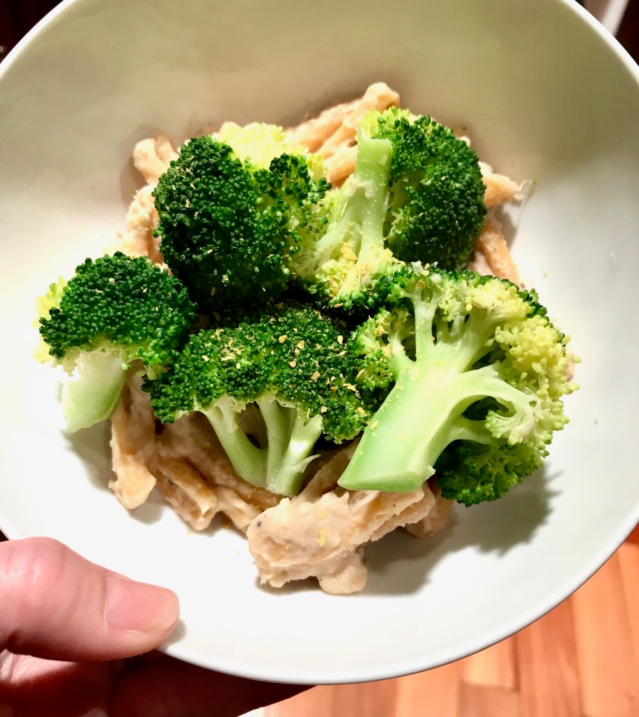 Once pasta is cooked and drained, return pasta to its pan, pour sauce over pasta, and mix. Top the pasta with desired amount of broccoli. Sprinkle with additional nutritional yeast or with vegan cheese if desired. This makes about 4 small servings. Enjoy!