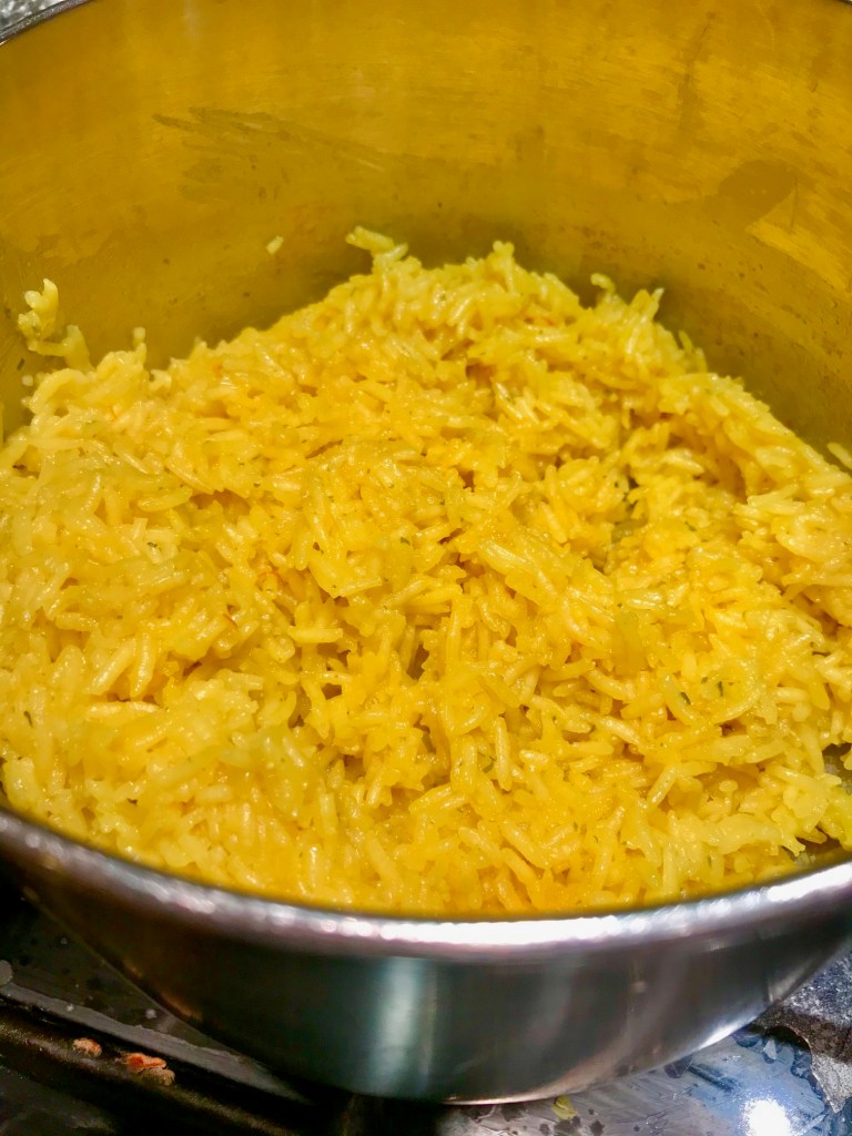 When I was little, a favorite side dish at my house was yellow rice. Do you know the kind? It comes in a bright yellow, shiny bag. It’s delicious, but it’s also full of MSG and other processed ingredients.