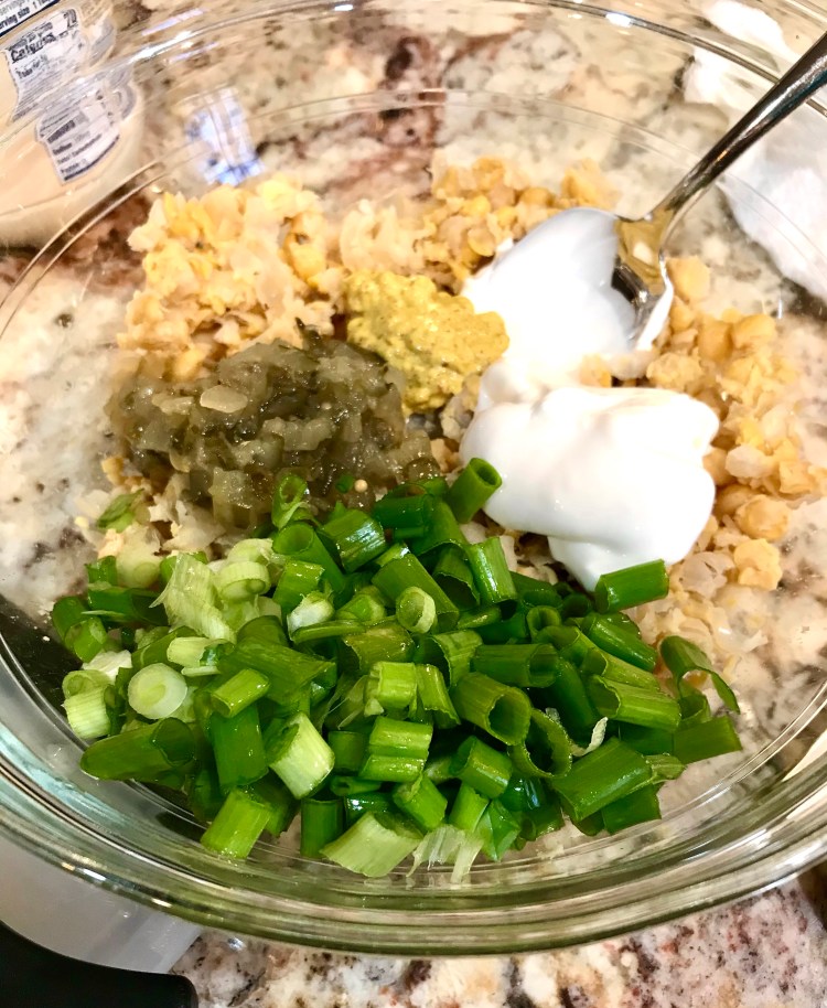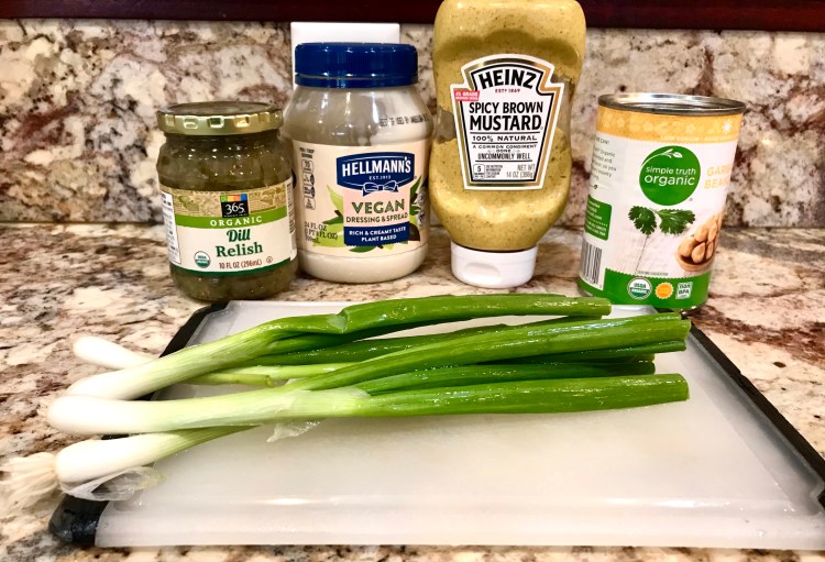 The key spice for this salad is dill. Using a bit of dill relish and a touch of dill weed with a dollop of spicy mustard adds the flavors I would typically incorporate into a traditional chicken salad. Use whatever vegan mayo is your favorite.