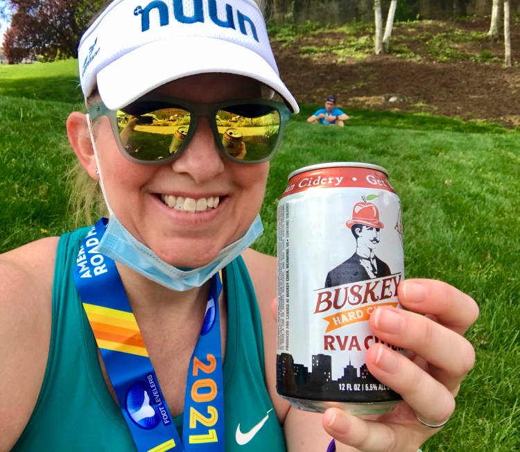 The post-race event was well organized with plenty of space to socially distance. Our names were called as we crossed the finish, which is always fun! People were generally compliant with the mask mandate, and the Blue Ridge Marathon even provided fresh, disposable masks at the finish. Instead of someone hanging your medal on you, you picked it up from a table. Post-race food was pre-packaged to limit exposure. And post-race free beers were from local craft breweries and in cans instead of from kegs in the name of safety. I enjoyed my brew from Three Notch’d, which happened to be a Buskey cider from my native RVA.