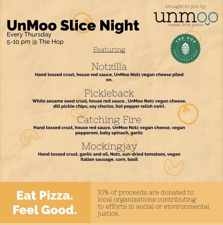 What’s even better is that they have Unmoo Vegan Slice night every Thursday with a rotating variety of vegan options. One day, I will make it to one of these! If you’ve never had Unmoo cheese, you should. It’s a cashew based vegan cheese that melts like dairy mozzarella, and it’s made locally in the RVA. It really makes the pizza. A Thursday visit supports two locally owned businesses at once!