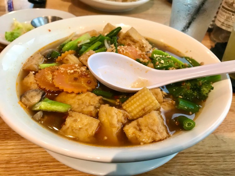 My favorite dishes there? Their spicy noodle soup can be made vegan, featuring a flavorful broth and tofu, and their noodles of the drunk can as well. You can choose wide or thin noodles with this! I always choose wide rice noodles with tofu and add broccoli. On the appetizer menu, they have vegetable dumplings and veggie spring rolls that are vegan as well. Sadly, their curry dishes cannot be made vegan.