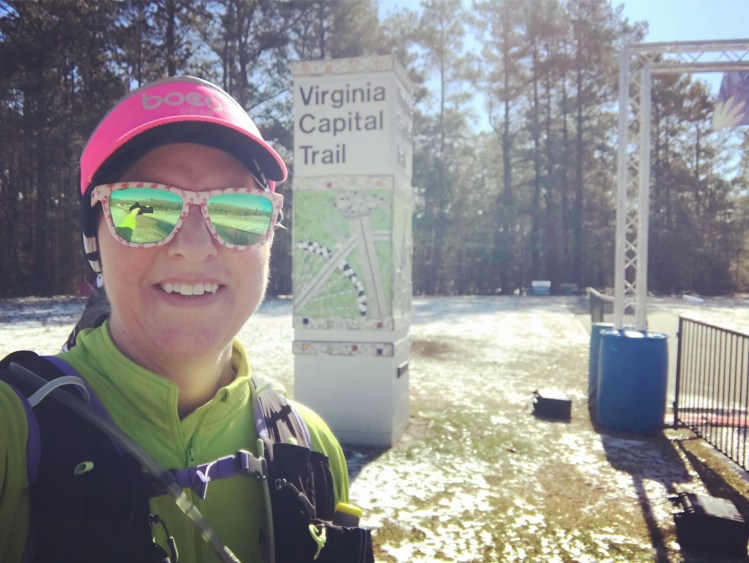 Mother Nature had some wicked plans for this race weekend, however. Although Friday was gorgeous, sunny and in the 60’s with a warm breeze, Saturday was a typical Virginia late winter/early spring temper tantrum. I was awakened early that morning by thunder, lightning, heavy rain, and howling wind. The temperature was in the upper 50’s when I left for work Saturday. And although I took every patient who desired to do so outside on Friday, I wouldn’t have dreamed of it Saturday. By mid-morning, temperatures had dropped into the 30’s, and it was snowing. We got almost 2 inches of snow by the time the storm was done! Sports Backers wisely closed the course on Saturday, as parts of the trail are prone to flooding. Sunday was sunny, but the high was only in the 40’s, with temps at 7am in the teens!