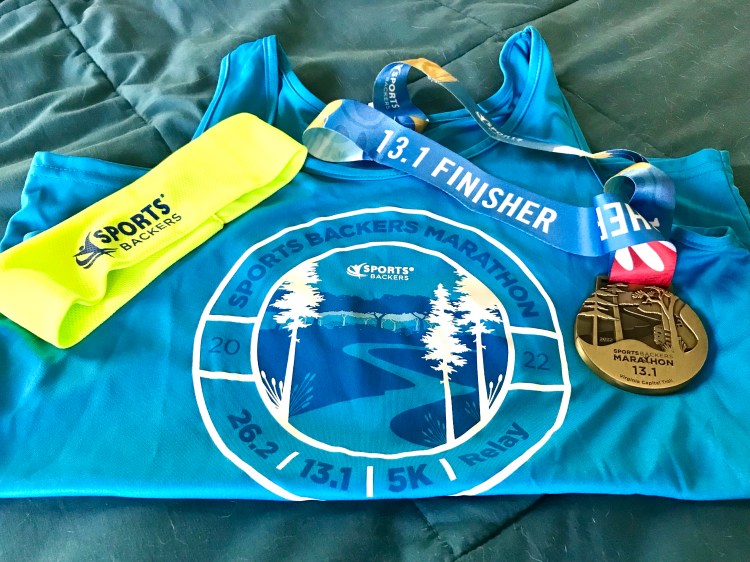 Sports Backers put on their newish format, semi-pandemic cautious, multi-day race again this year. It’s just casual enough to not create too much anxiety about race day, but with distances from a 5k to a full marathon, it’s serious enough to suit any runner! You may remember that I ran the half marathon last year with my best friend. We are so lucky in the Richmond area to have the Capital Trail, a multi-use path that connects downtown Richmond to Jamestown, and this race uses portions of this path, beginning and ending in Dorey Park in Henrico County. The course was scheduled to be open Friday through Sunday, 7-3.