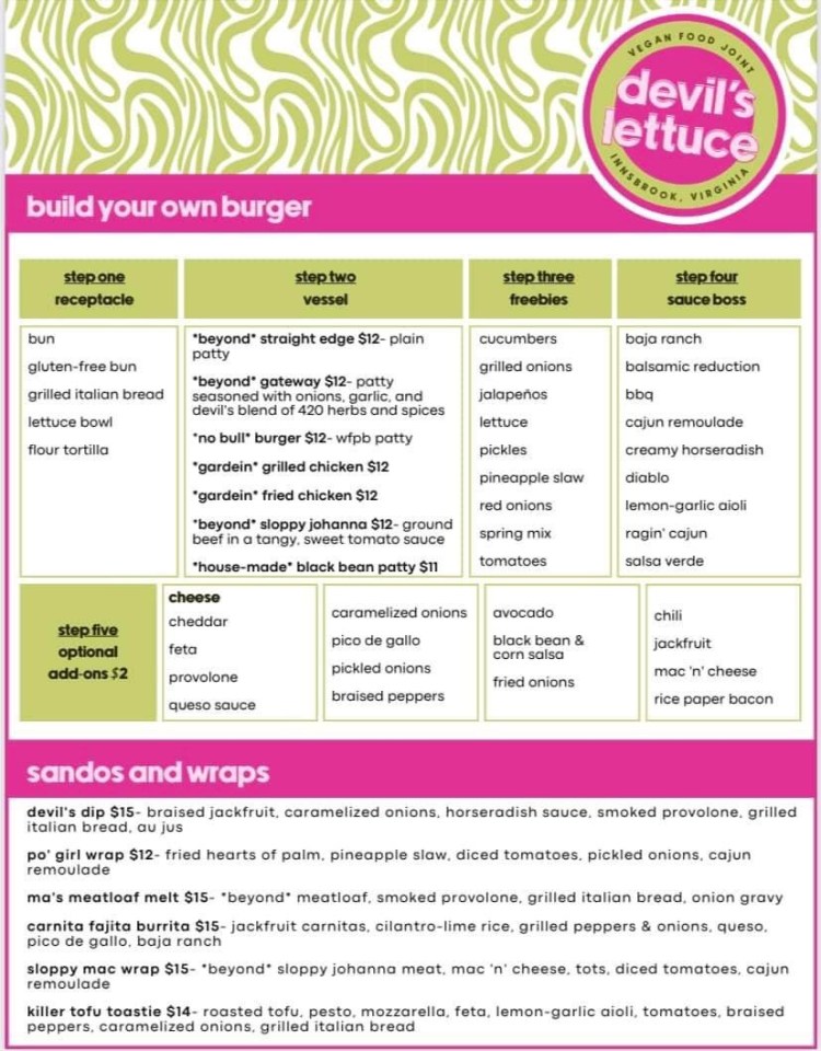 With a name like Devil’s Lettuce, you may pick up on a theme here. There are several references to the herbal refreshment, from the “vegan food joint” to the “420 herbs and spices” blend for their Gateway burger. It’s cheeky!