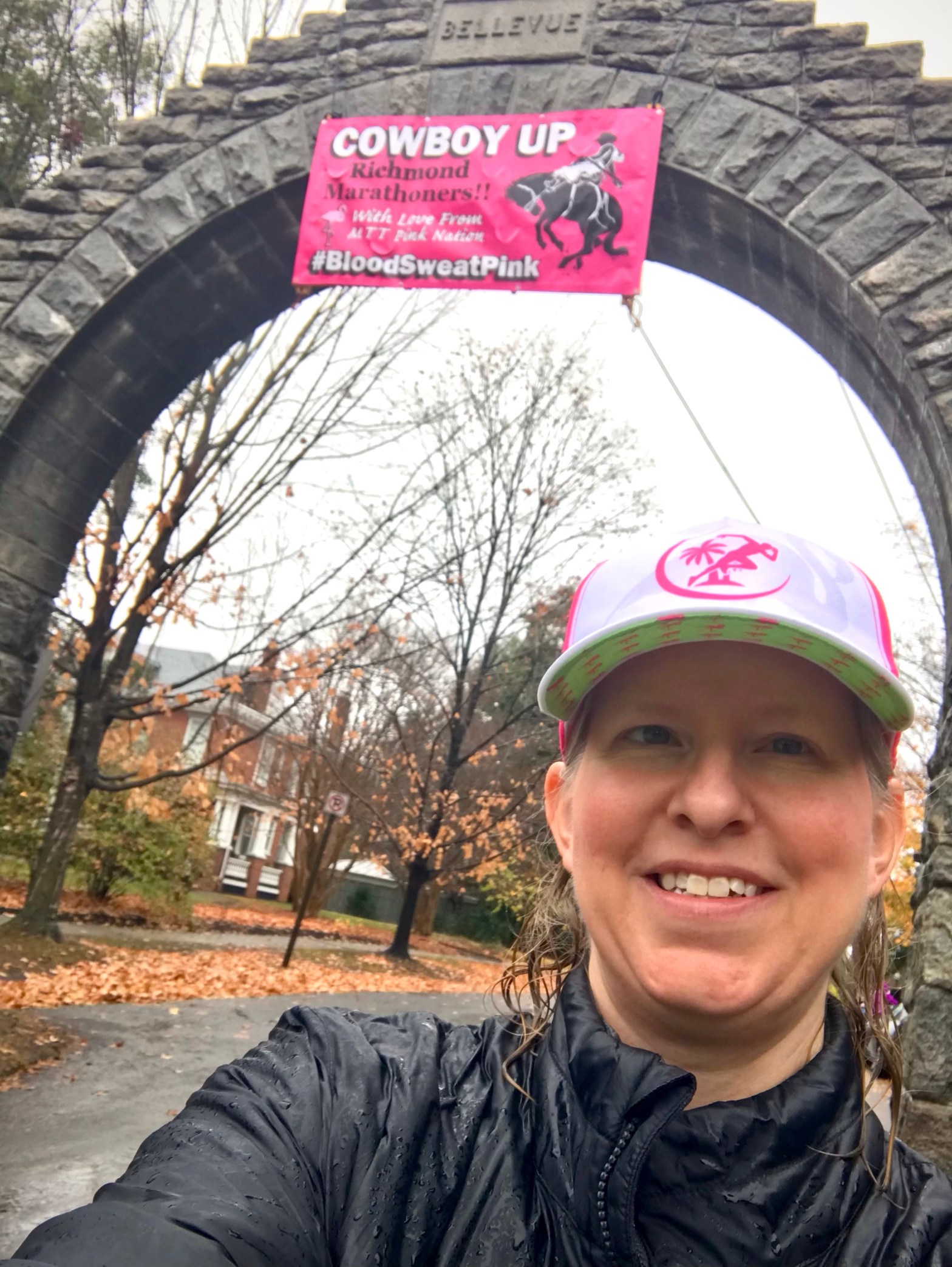 Those of us Pink Nation coaches who could adjust our work schedules made it out early in the rain pre-race day to hang the Pink Nation sign at the Pope Arch, which greets both half and full marathoners as they enter Northside. I’ve never been able to be a part of this coach’s tradition, so I’m grateful to have learned the secrets! And, y’all, it’s really something! But secrets are secrets.