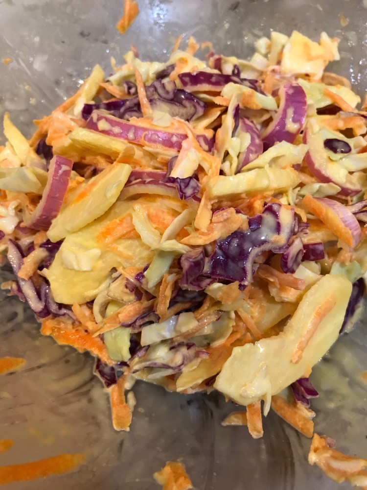 Are you looking for a more creative version of the traditional cole slaw? Something both sweet and tangy? With the crunch and sweetness of apple, the creaminess of the mayo, the bite of red onion and spicy mustard, and the acidity of apple cider vinegar, this is a tasty summer side dish and a great accompaniment to a wrap, sandwich, or jackfruit barbecue!